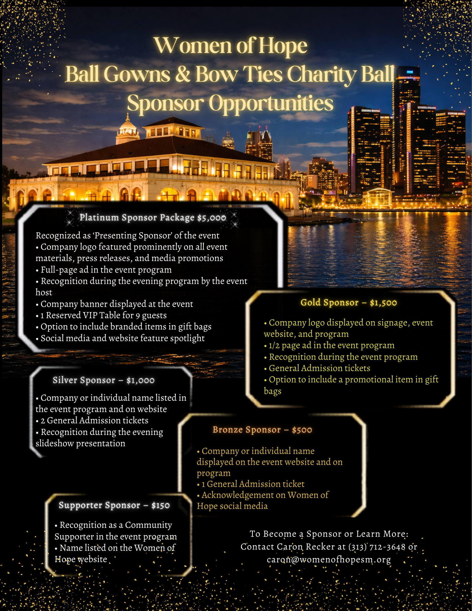 Sponsors help make the Ball Gowns & Bow Ties Charity Gala possible while also receiving visibility as supporters of Women of Hope and its mission.